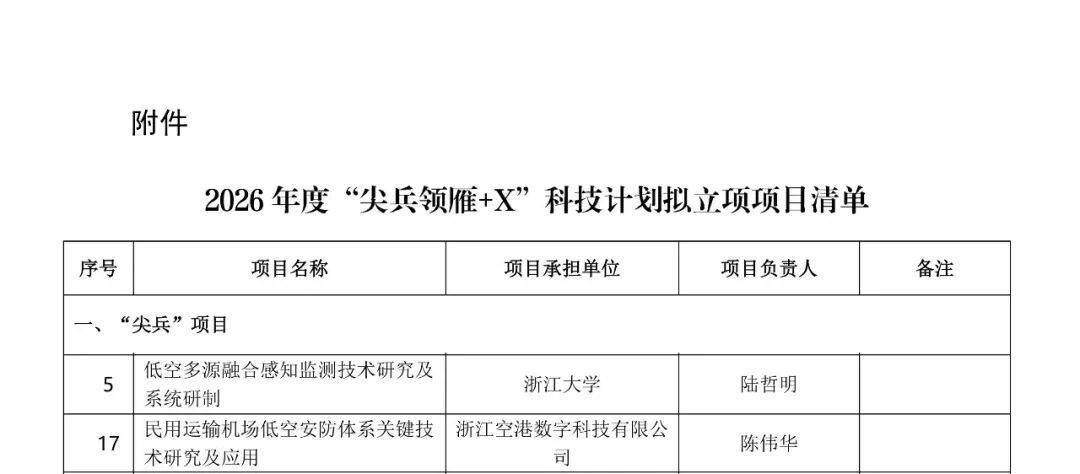 近日,浙江省科学技术厅公示2026年度“尖兵领雁+X”科技计划拟立项项目名单。杰能科世联合浙江大学申报的“低空多源融合感知监测技术研究及系统研制”项目,以及联合浙江空港数字科技有限公司申报的“民用运输机场低空安防体系关键技术研究及应用”项目,双双入选。