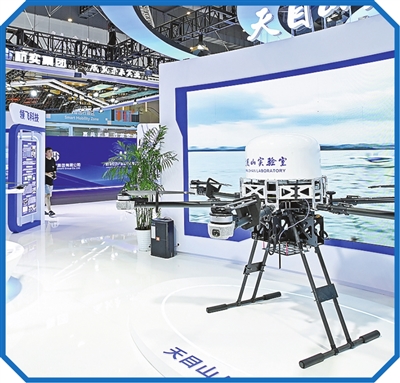余杭依托“中国飞谷”,重点发力低空数智产业、低空应用和飞服保障,其中天目山实验加快关键技术研发攻坚,在本届数贸会上带来了“天目山一号”2.0版多旋翼氢动力长航时无人机。